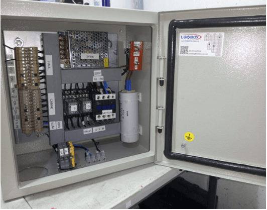 Na parte de potência, o comando possui saída de 220V ou 380V para alimentação da central hidráulica, conforme a necessidade do projeto. Além disso, conta com saída de 24Vdc exclusiva para o acionamento da válvula de descida, proporcionando controle suave e eficiente nos movimentos da plataforma.